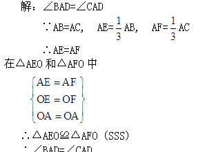 雨伞的中截面如图所示,伞骨AB=AC,支撑杆OE=OF,AE=AB,AF=AC,当O沿AD滑动时,雨伞开闭,问雨伞开闭过程中,∠BAD与∠CAD有何关系?说明理由。
