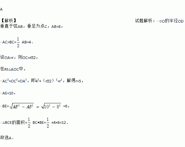 如图,⊙O的半径OD垂直于弦AB,垂足为点C,连接AO并延长交⊙O于点E,连接BE,CE.若AB=8,CD=2,则△BCE的面积为( )