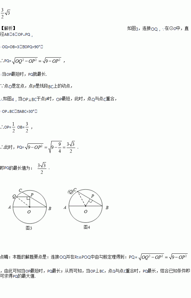 如图,在⊙O中,直径AB=6,BC是弦,∠ABC=30°,点P在BC上,点Q在⊙O上,且OP⊥PQ,当点P在BC上移动时,则PQ长的最大值为__________.