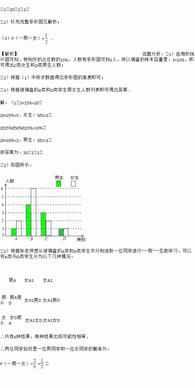 (1)20,2,1; (2)补充完整条形图见解析; (3)P(一男一女)=. 【解析】试题分析:(1)由扇形统计图可知,特别好的占总数的15%,人数有条形图可知3人,所以调查的样本容量是:3÷15%,即可得出C类女生和D类男生人数; (2)根据(1)中所求数据得出条形图的高度即可; (3)根据被调査的A类和D类学生男女生人数列表即可得出答案. 【解析】 (1)...