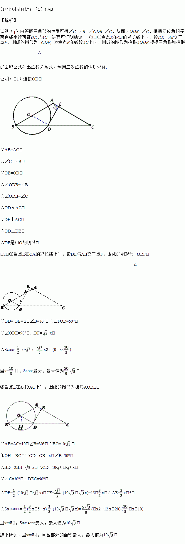 如图,在△ABC中,AB=AC=10,∠B=30°,O是线段AB上的一个动点,以O为圆心,OB为半径作⊙O交BC于点D,过点D作直线AC的垂线,垂足为E.