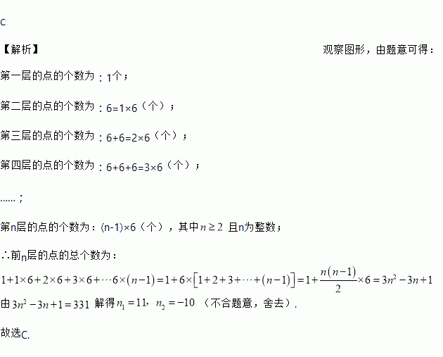 如图,有一个形如六边形的点阵,它的中心是一个点,作为第一层,第二层每边有两个点,第三 层每边有三个点,依次类推,如果n层六边形点阵的总点数为331,则n等于( )