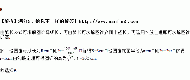 将弧长为2πcm、圆心角为120°的扇形围成一个圆锥的侧面,则这个圆锥的高是( )