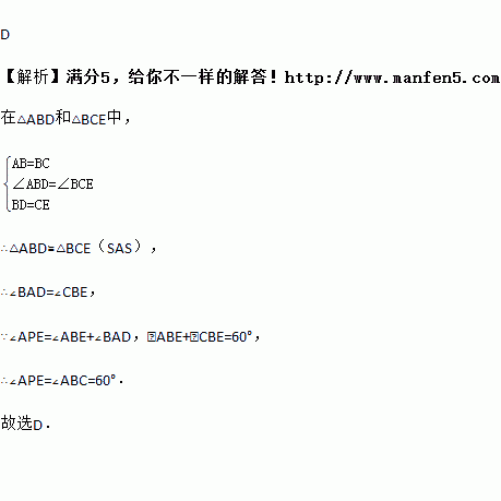 如图所示,△ABC中,AB=BC=AC,∠B=∠C=60°,BD=CE,AD与BE相交于点P,则∠APE的度数是( )