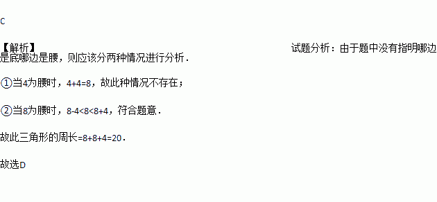 等腰三角形两边长分别为4和8,则这个等腰三角形的周长为( )