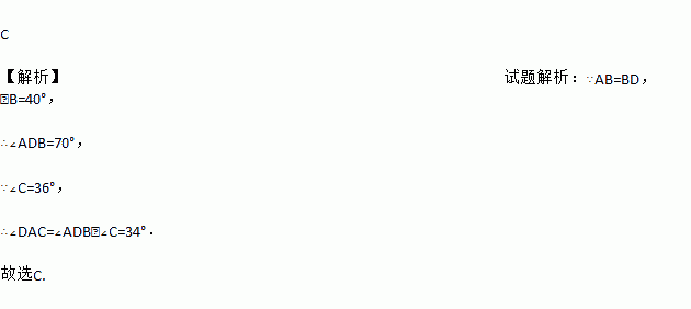 如图,在△ABC中,以点B为圆心,以BA长为半径画弧交边BC于点D,连接AD.若∠B=40°,∠C=36°,则∠DAC的度数是( )