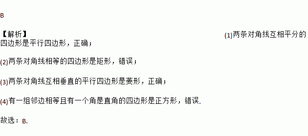 B 【解析】(1)两条对角线互相平分的四边形是平行四边形,正确; (2)两条对角线相等的四边形是矩形,错误; (3)两条对角线互相垂直的平行四边形是菱形,正确; (4)有一组邻边相等且有一个角是直角的四边形是正方形,错误. 故选:B.