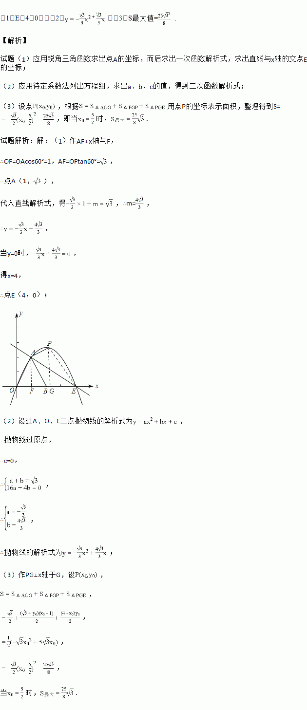 (3)若P是(2)中求出的抛物线AE段上的一动点(不与A、E重合),设四边形OAPE的面积为S,求S的最大值。