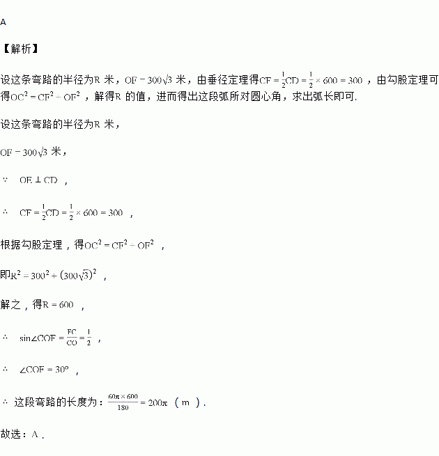如图,一条公路的转变处是一段圆弧(即图中弧,点是弧的圆心),其中米,为弧一点,且,垂足为,米,则这段弯路的长度为( )