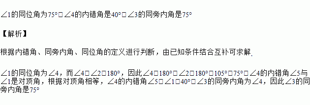 如图所示,直线a,b被直线c所截,∠1=40°,∠2=105°,求∠1的同位角,∠4的内错角,∠3的同旁内角的度数.