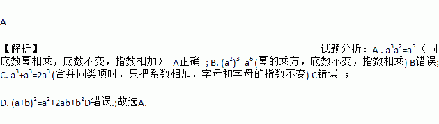 A 【解析】试题分析:A . a3a2=a5 (同底数幂相乘,底数不变,指数相加) A正确 ; B. (a2)3=a6 (幂的乘方,底数不变,指数相乘) B错误; C. a3+a3=2a3 (合并同类项时,只把系数相加,字母和字母的指数不变) C错误 ; D. (a+b)2=a2+2ab+b2D错误.;故选A.