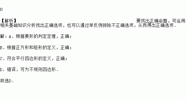 D 【解析】要找出正确命题,可运用相关基础知识分析找出正确选项,也可以通过举反例排除不正确选项,从而得出正确选项. 【解析】 A、根据菱形的判定定理,正确; B、根据正方形和矩形的定义,正确; C、符合平行四边形的定义,正确; D、错误,可为不规则四边形. 故选D.