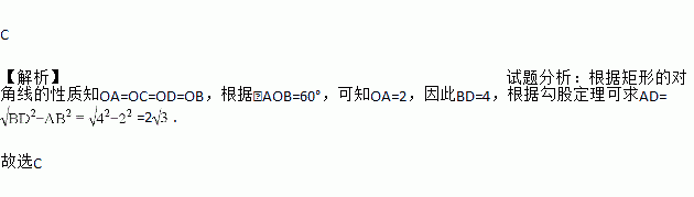 如图,矩形ABCD的两条对角线相交于点O,∠AOB=60°,AB=2,则矩形的边长BC的长是( )