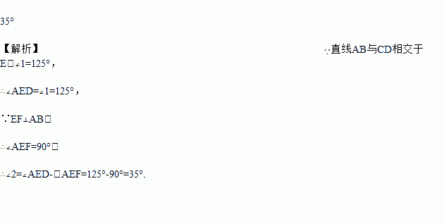 如图,直线AB与CD相交于E点,EF⊥AB,垂足为E,∠1=125°,则∠2的度数是__________.