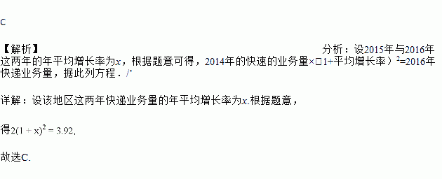 快递公司2014年的快递业务量为2亿件,受益于经济的快速增长及电子商务发展等多重因素,快递业务迅猛发展,2016年的快递业务量达到3.92亿件.若设该地区这两年快递业务量的年平均增长率为x,则下列方程正确的是( )