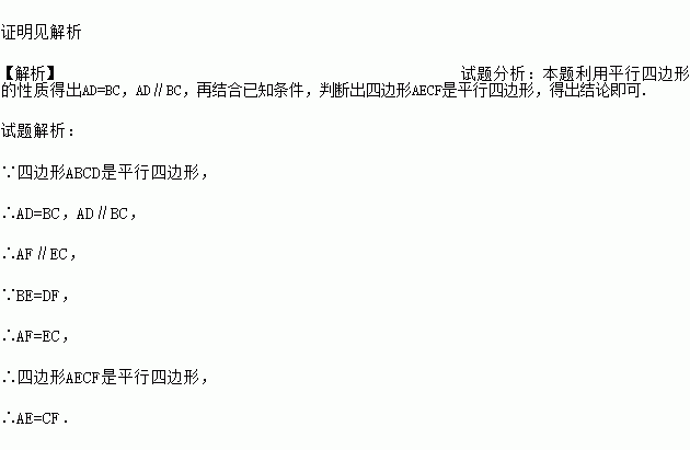 如图,在?ABCD中,已知点E、F分别在边BC和AD上,且BE=DF.求证:AE=CF.