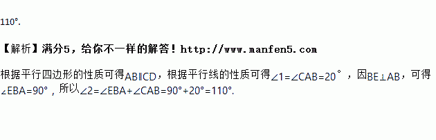 如图,在?ABCD中,BE⊥AB交对角线AC于点E,若∠1=20°,则∠2的度数为__.