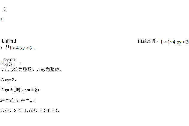 我们定义,例如=2×5-3×4=10-12=-2,若x,y均为整数,且满足1<<3,则x+y的值是_____________.