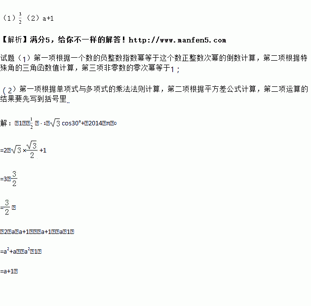 (1)计算:()﹣1﹣cos30°+(2014﹣π)0;