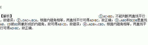 如图,给出下列四个条件:①AC=BD;②∠DAC=∠BCA;③∠ABD=∠CDB;④∠ADB=∠CBD,其中能使AD∥BC的条件是( )