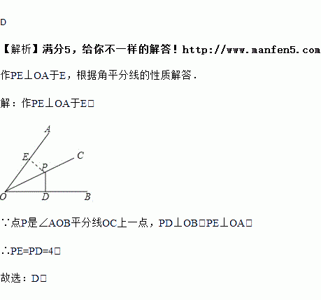 如图,点P是∠AOB平分线OC上一点,PD⊥OB,垂足为D,若PD=4,则点P到边OA的距离是( )