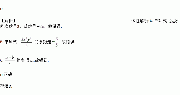 D 【解析】试题解析:A. 单项式的次数是2,系数是 故错误. B. 单项式的系数是故错误. C. 是多项式.故错误. D.正确. 故选D.