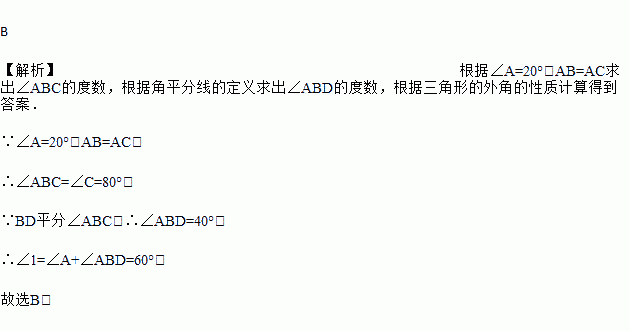 如图,等腰三角形ABC中,AB=AC,BD平分∠ABC,若∠A=20°,则∠1的度数为( )