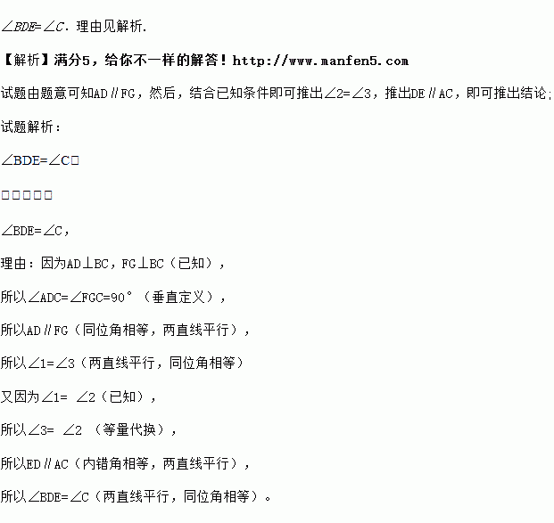 如图,已知AD⊥BC,FG⊥BC,垂足分别为点D,G,且∠1=∠2,猜想:∠BDE与∠C有怎样的关系?说明理由.