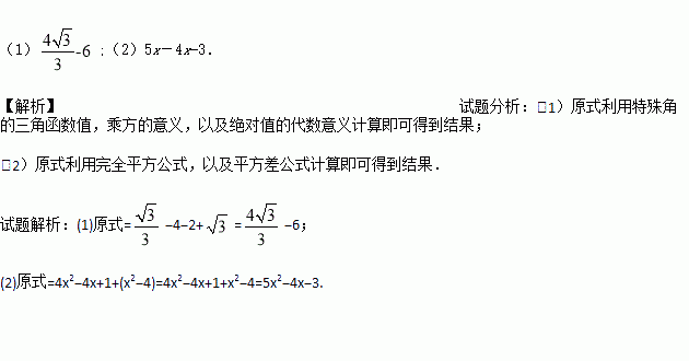 计算:(1)tan30º-(-2)2-. (2)(2x-1)2+(x-2)(x+2) .