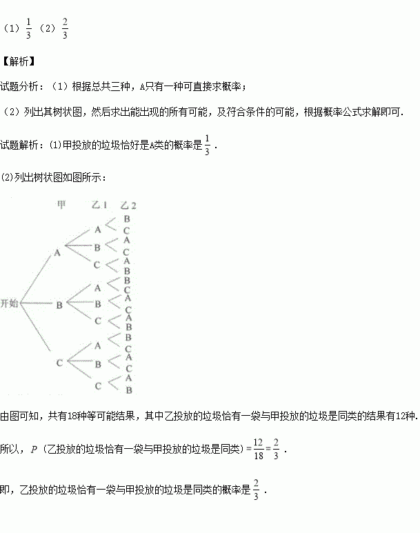 为落实“垃圾分类”,环卫部门要求垃圾要按A,B,C三类分别装袋,投放,其中A类指废电池,过期药品等有毒垃圾,B类指剩余食品等厨余垃圾,C类指塑料,废纸等可回收垃圾.甲投放了一袋垃圾,乙投放了两袋垃圾,这两袋垃圾不同类.