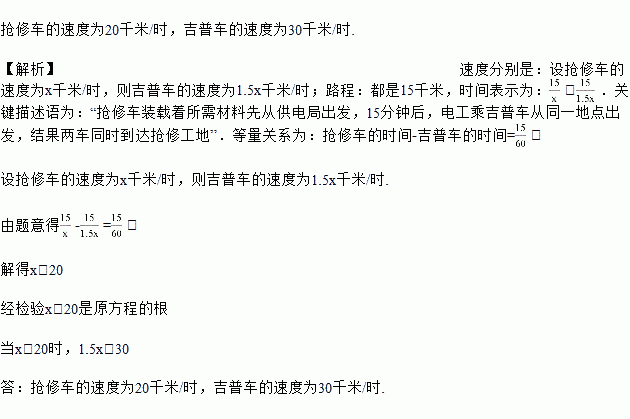 由于某地供水管爆裂.该地供水部门组织工人进行抢修.供水部门距离抢修工地15千米.抢修车装载着所需材料先从供水部门出发,15分钟后,工人乘吉普车从同一地点出发,结果他们同时到达抢修工地.已知吉普车速度是抢修车速度的1.5倍,求这两种车的速度.