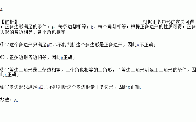 A 【解析】根据正多边形的定义可得:正多边形满足的条件:a、每条边都相等;b、每个角都相等;根据正多边形的性质可得:正多边形的各边相等,各个角也相等. ①∵这个多边形只满足a,∴不能判断这个多边形是正多边形,因此A不正确; ②∵正多边形各边相等,因此B正确; ③∵等边三角形是三条边相等,三个角也相等的三角形,∴等边三角形满足正三角形的条件,因此C正确; ④∵多边形只满...