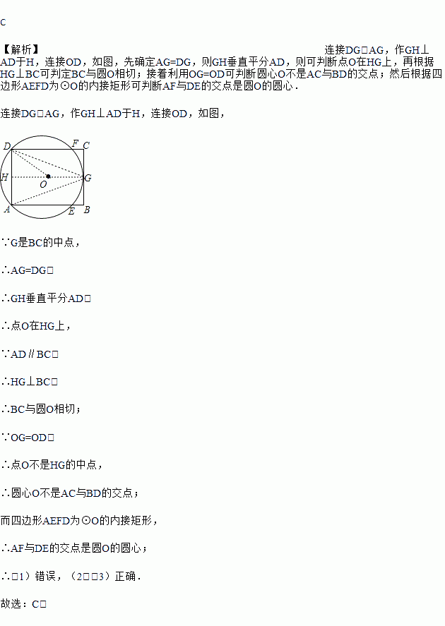 如图,矩形ABCD中,G是BC的中点,过A、D、G三点的圆O与边AB、CD分别交于点E、点F,给出下列说法:(1)AC与BD的交点是圆O的圆心;(2)AF与DE的交点是圆O的圆心;(3)BC与圆O相切,其中正确说法的个数是( )