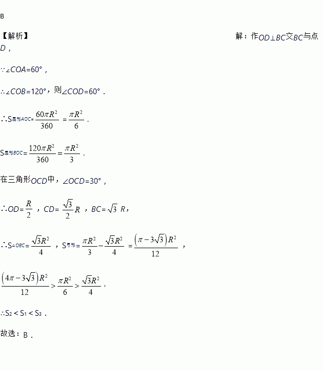 如图,AB为半圆O的直径,C是半圆上一点,且∠COA=60°,设扇形AOC、△COB、弓形BmC的面积为S1、S2、S3,则它们之间的关系是( )