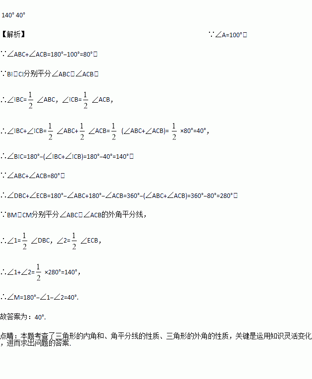 如图,△ABC中,∠A=100°,BI、CI分别平分∠ABC,∠ACB,则∠BIC=________,若BM、CM分别平分∠ABC,∠ACB的外角平分线,则∠M=__________.