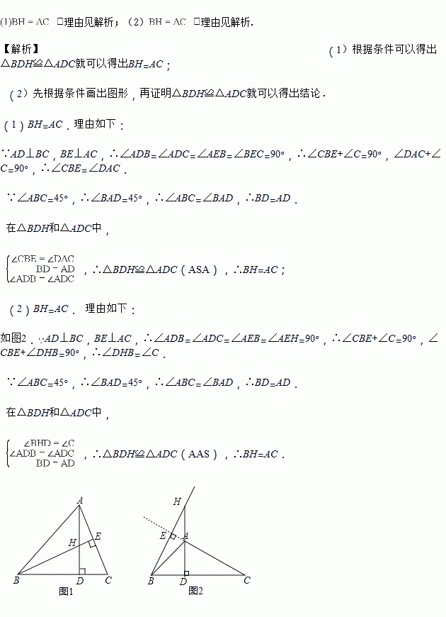 请你猜想BH和AC之间的数量关系,并说明理由;![]()