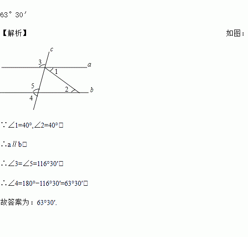 如图,若∠1=40°,∠2=40°,∠3=116°30′,则∠4=_______.