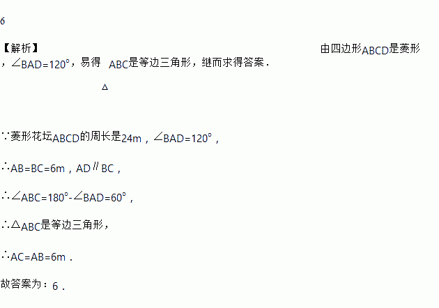 如图,己知某菱形花坛ABCD的周长是24m,∠BAD=120°,则花坛对角线AC的长是_____________m.