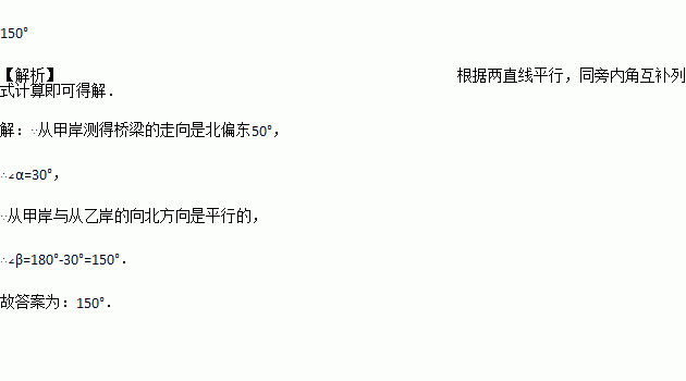 如图,甲、乙两岸之间要架一座桥梁,从甲岸测得桥梁的走向是北偏东50°,如果甲、乙两岸同时开工.要使桥梁准确连接,那么在乙岸施工时,应按β为_____度的方向动工.
