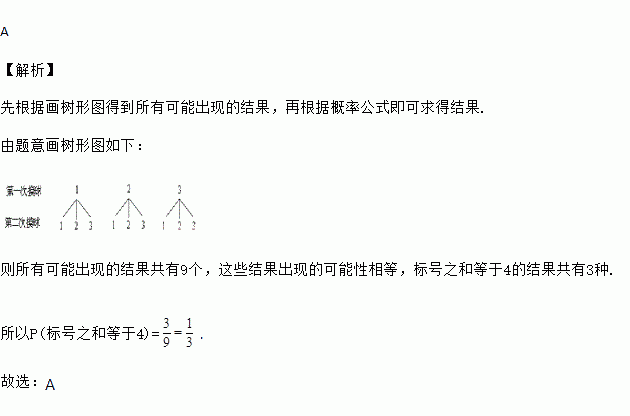 在一个口袋中有3个完全相同的小球,把它们分别标号为1,2,3,从口袋中随机摸出一个小球记下标号后放回,再随机摸出一个小球记下标号,两次摸出小球的标号之和等于4的概率是![]()