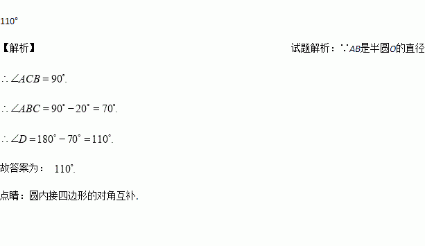 如图,已知AB是半圆O的直径,∠BAC=20°,D是弧AC上任意一点,则∠D的度数是_________.