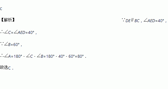 如图,已知D、E在△ABC的边上,DE∥BC,∠B=60°,∠AED=40°,则∠A的度数为( )