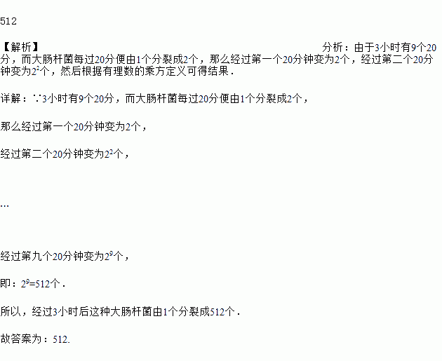 大肠杆菌每过20分便由1个分裂成2个,经过3小时后这种大肠杆菌由1个分裂成_____个.