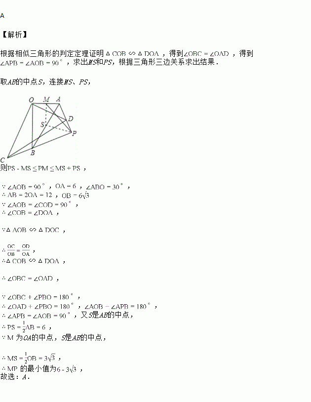如图,∽,,,M为OA的中点,,将绕点O旋转一周,直线AD,CB交于点P,连接MP,则MP的最小值是