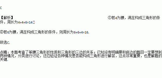 等腰三角形的两边长分别为4、6,则其周长为 ( )