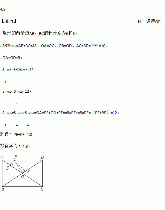 如图,P是矩形ABCD的边AD上一个动点,矩形的两条边AB、BC的长分别为6和8,那么点P到矩形的两条对角线AC和BD的距离之和是 .