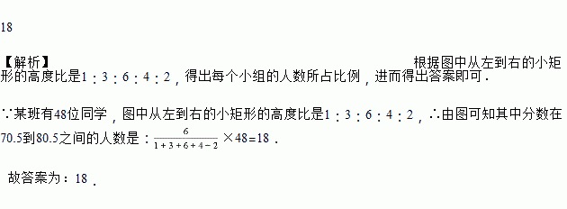 某班有48名同学,在一次数学测验中,分别只取整数统计其成绩,绘制出频数分布直方图如图所示,图中从左到右的小矩形的高度比是1∶3∶6∶4∶2,则分数在70.5到80.5之间的人数是___________.