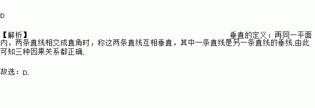 D 【解析】垂直的定义:再同一平面内,两条直线相交成直角时,称这两条直线互相垂直,其中一条直线是另一条直线的垂线.由此可知三种因果关系都正确. 故选:D.