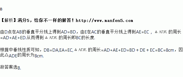 如图,的两边和的垂直平分线分别交于、,如果边长为,则的周长为( )