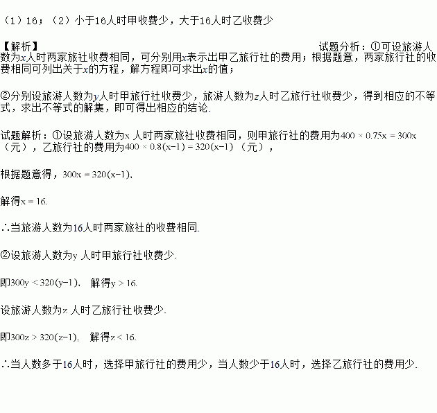 某实验学校准备在“十一”黄金周组织部分教师到陕西安康旅游,现联系了甲、乙两旅行社,两家旅行社报价均为400元/人,同时两旅行社对10人以上的团体推出了优惠举措:甲旅行社对每位游客七五折优惠;乙旅行社是免去一位带队老师的费用,其余的八折优惠①求人数为多少时,两家旅行社的收费相同?②请你通过计算说明:旅游人数在什么范围时选择甲旅行社费用较少?旅游人数在什么范围时选择乙旅行社的费用较少?
